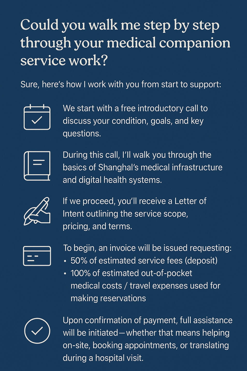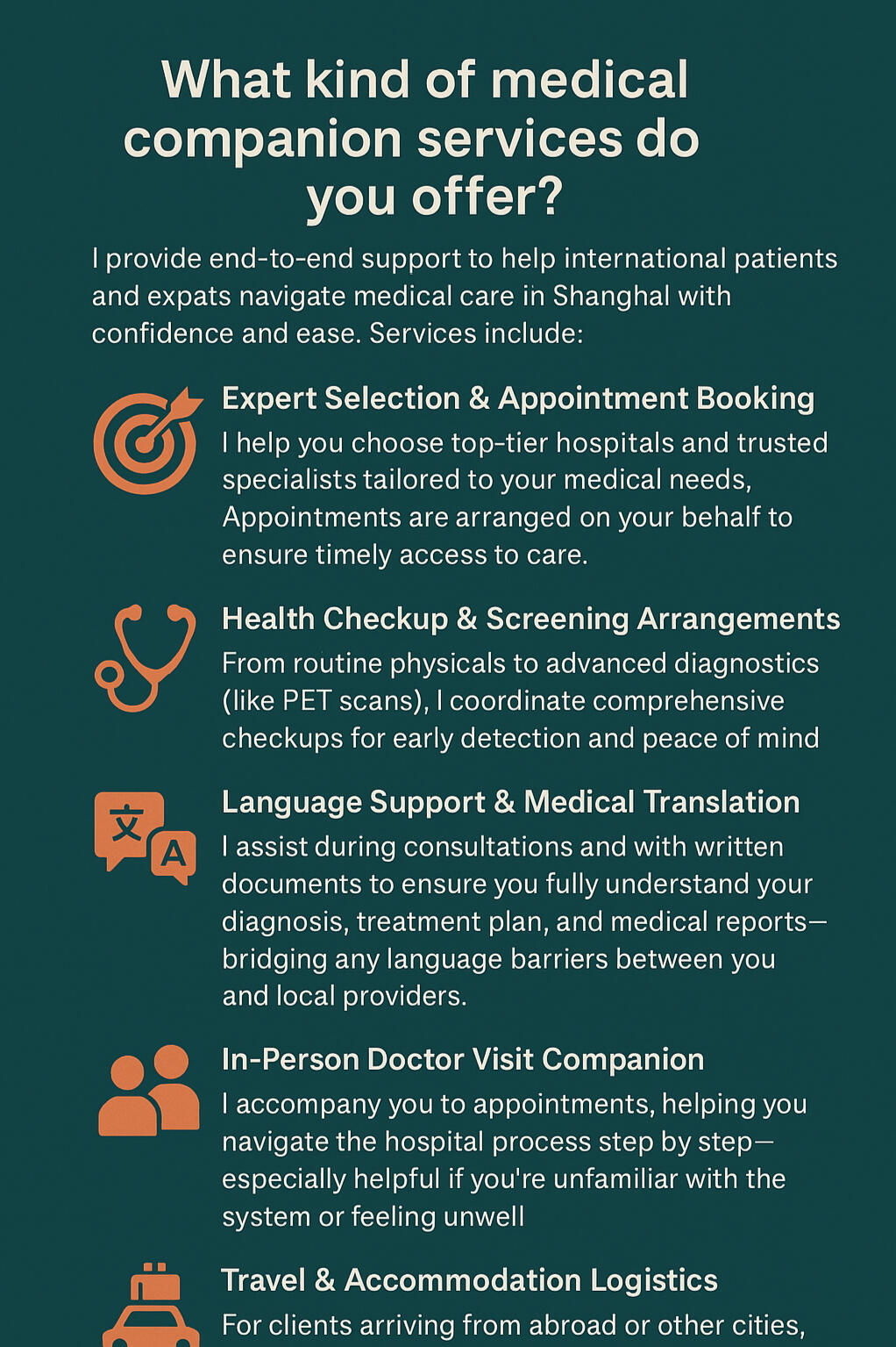 👉 Please refer to this guide [authorship: Genie Yip—highly recommend] for step-by-step instructions on how to navigate the local medical system as a resident. Of course, I'm happy to help if you'd require more assistance. :)2. How much do you charge for your service?My pricing is modular and flexible, ensuring you only pay for the level of support you need. In general, I charge for my time (research, on-site companionship) via an hourly or day rate, while specific logistical tasks (like reservations) are charged as a flat fee.How to get a quote: Because every case involves different logistics, please complete the Intake Form first. This allows me to review your specific needs and recommend the most efficient scope of work for you before we discuss the final numbers.💬 Final quotes are provided after the intro call and are open to discussion based on complexity and timeline.3.Which diseases are you specialised in offering support?